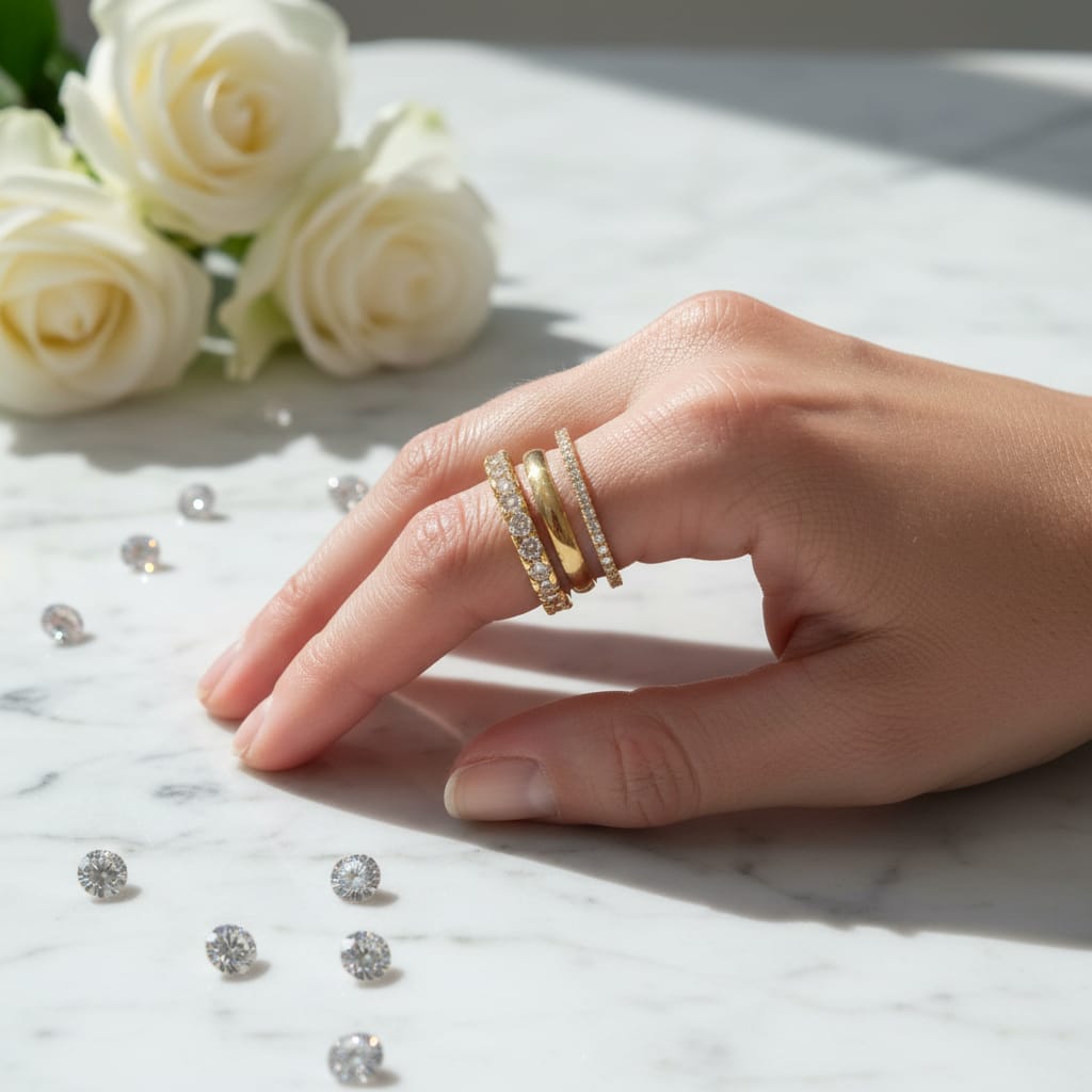 Anel alianças dourada, e zircónicas encrustadas, em aço inoxidável.