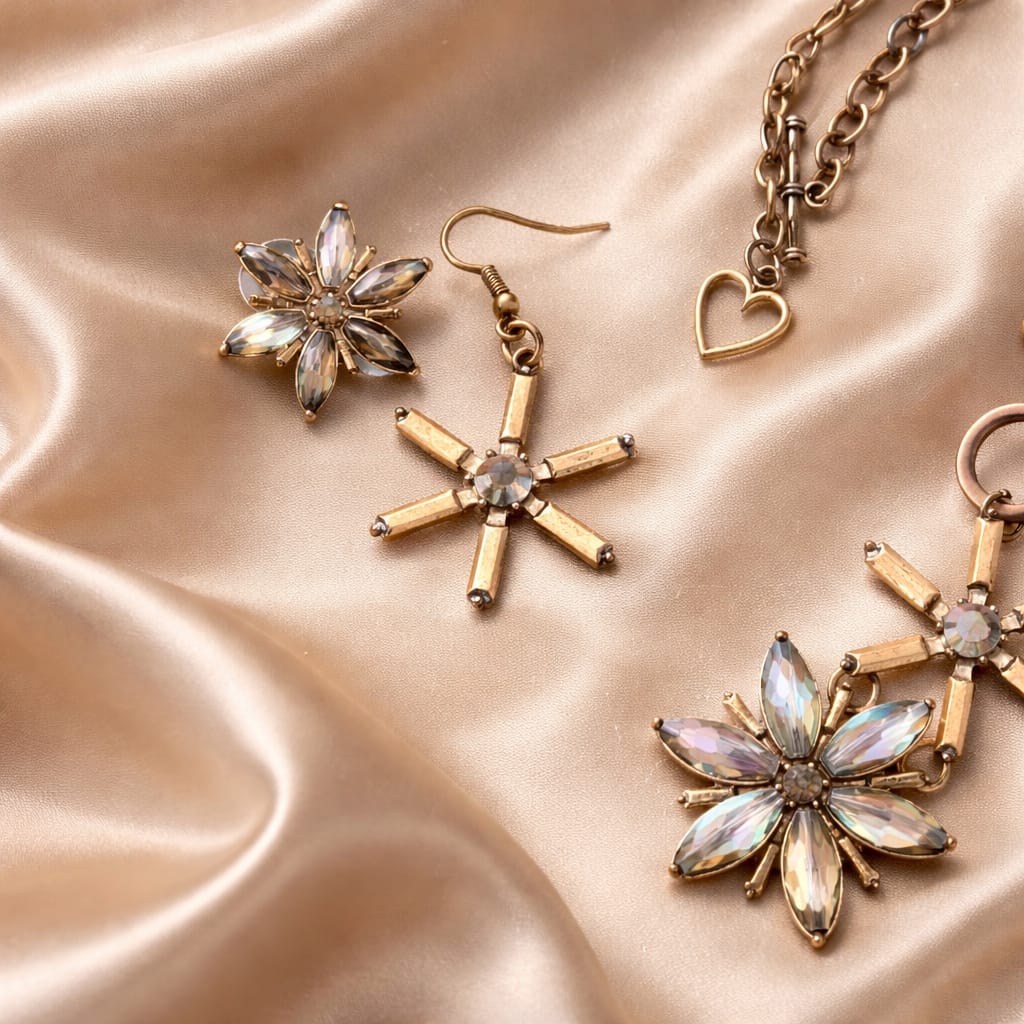 Brincos assimétricos com combinação de pingente flor com cristais iridescentes e estrela, em metal.