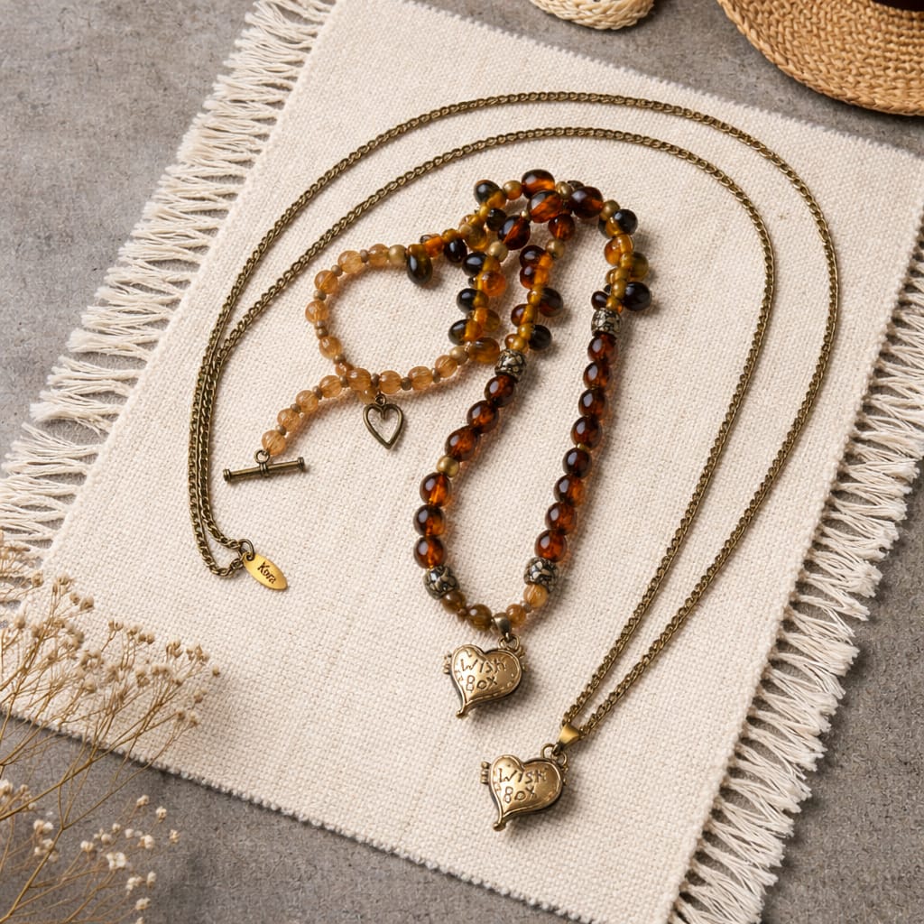 Colar de pedras amarelas e ambar detalhes em metal com pingente coração dourado com compartimento secreto.