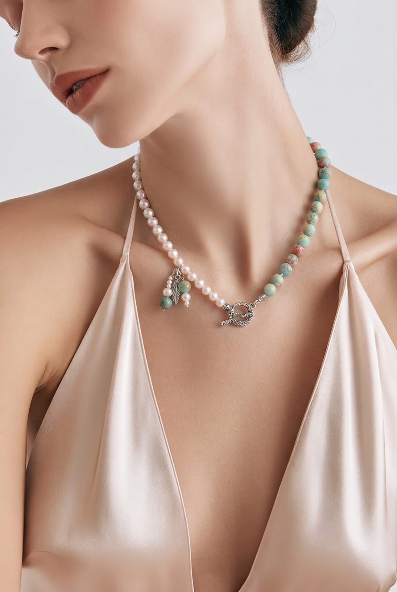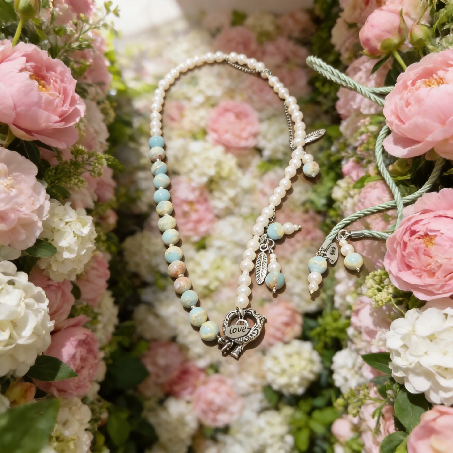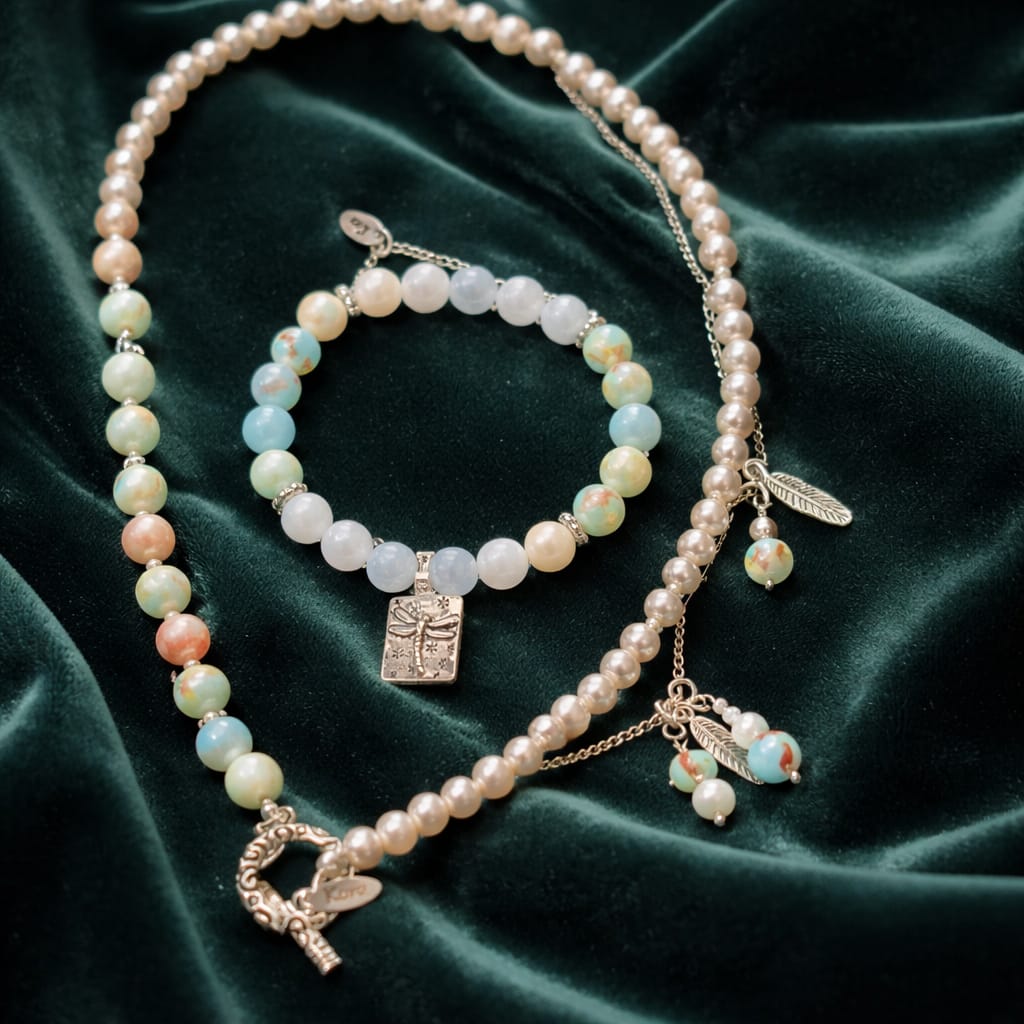Colar de pedras verdes com pingente em metal e aço inoxidável prateados.