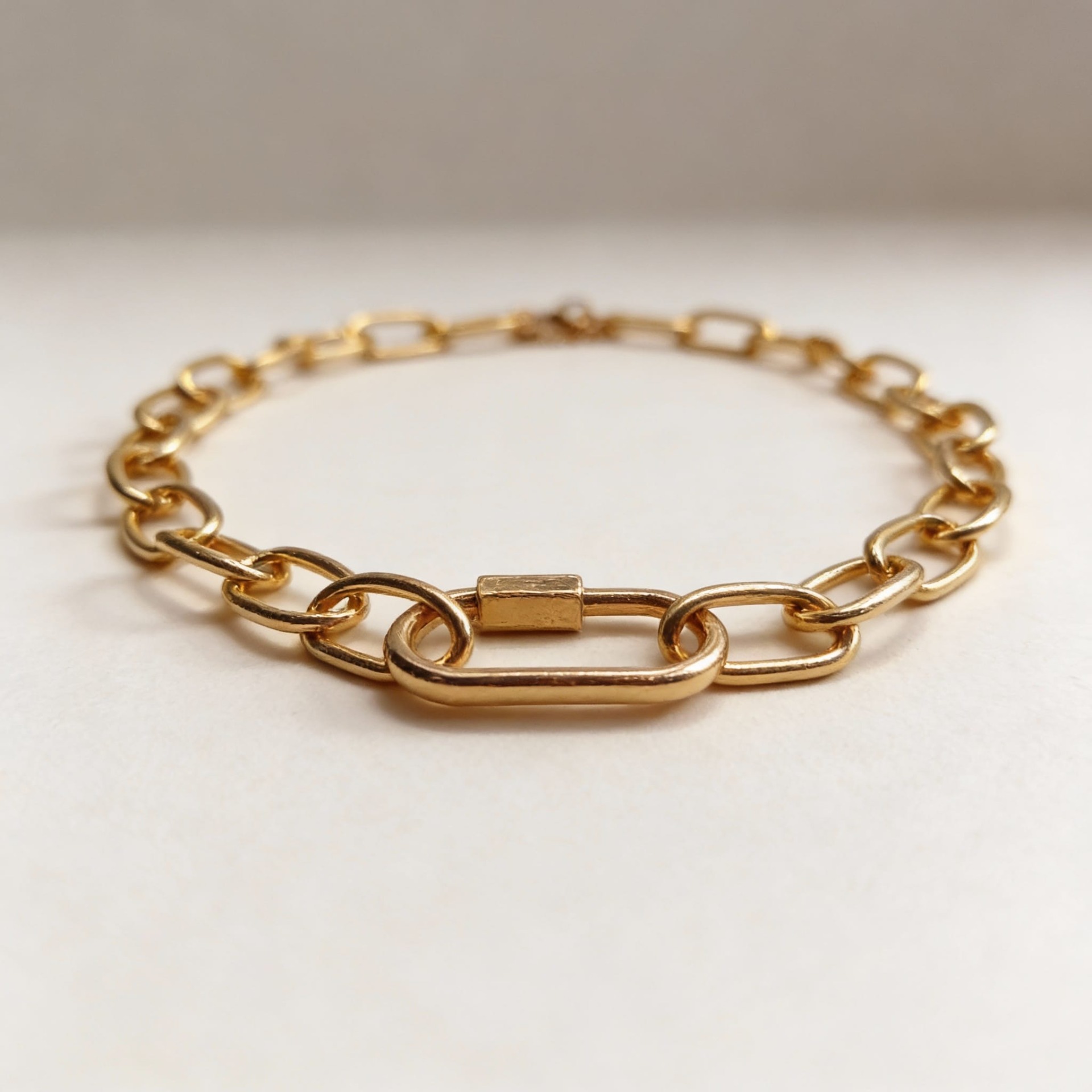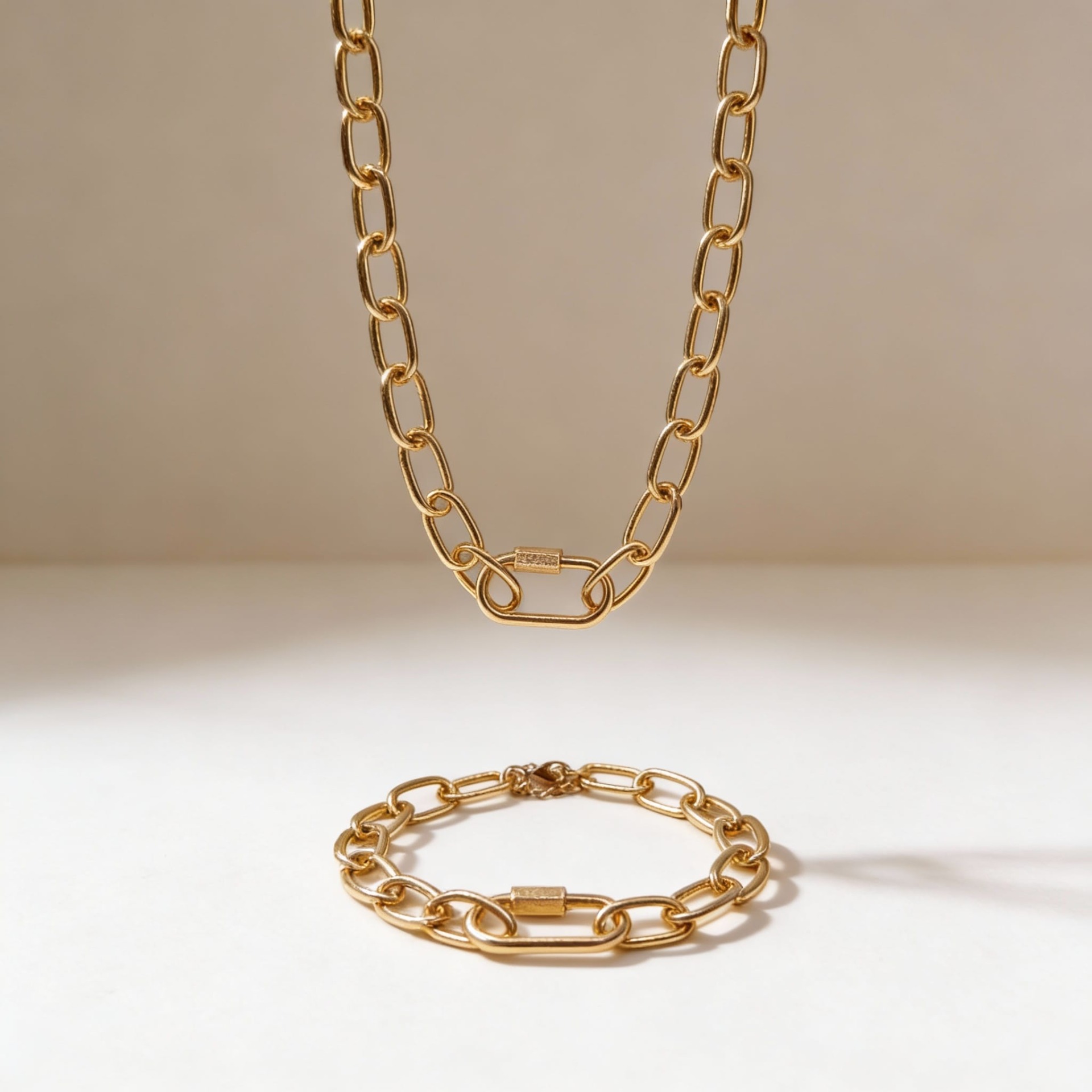 Gargantilha em malha larga dourada em aço inoxidável. Também disponível pulseira a combiar.