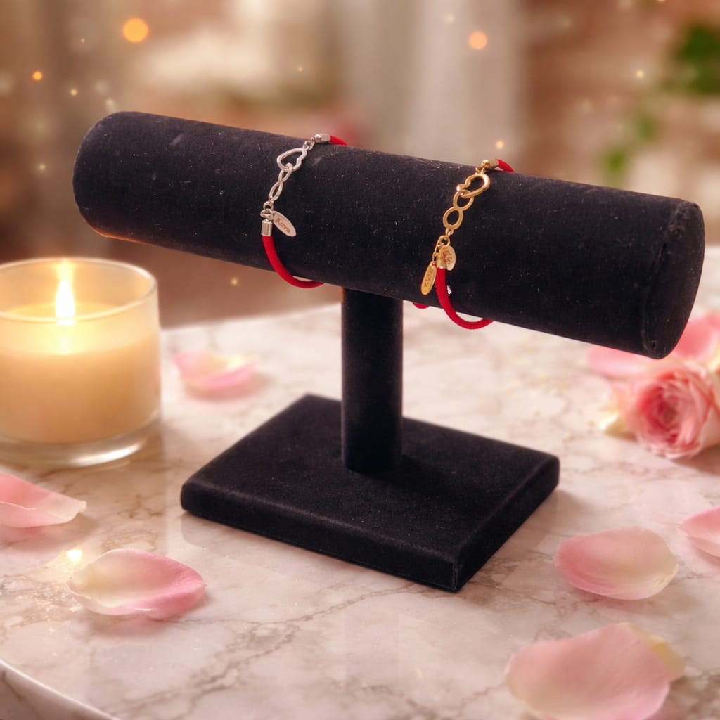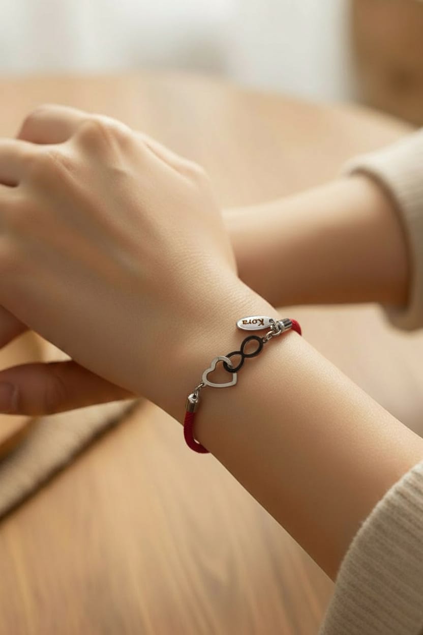 Pulseira em cordão vermelho, e símbolo coração e infinito em aço inoxidável. Feito à mão para a coleção Kora.