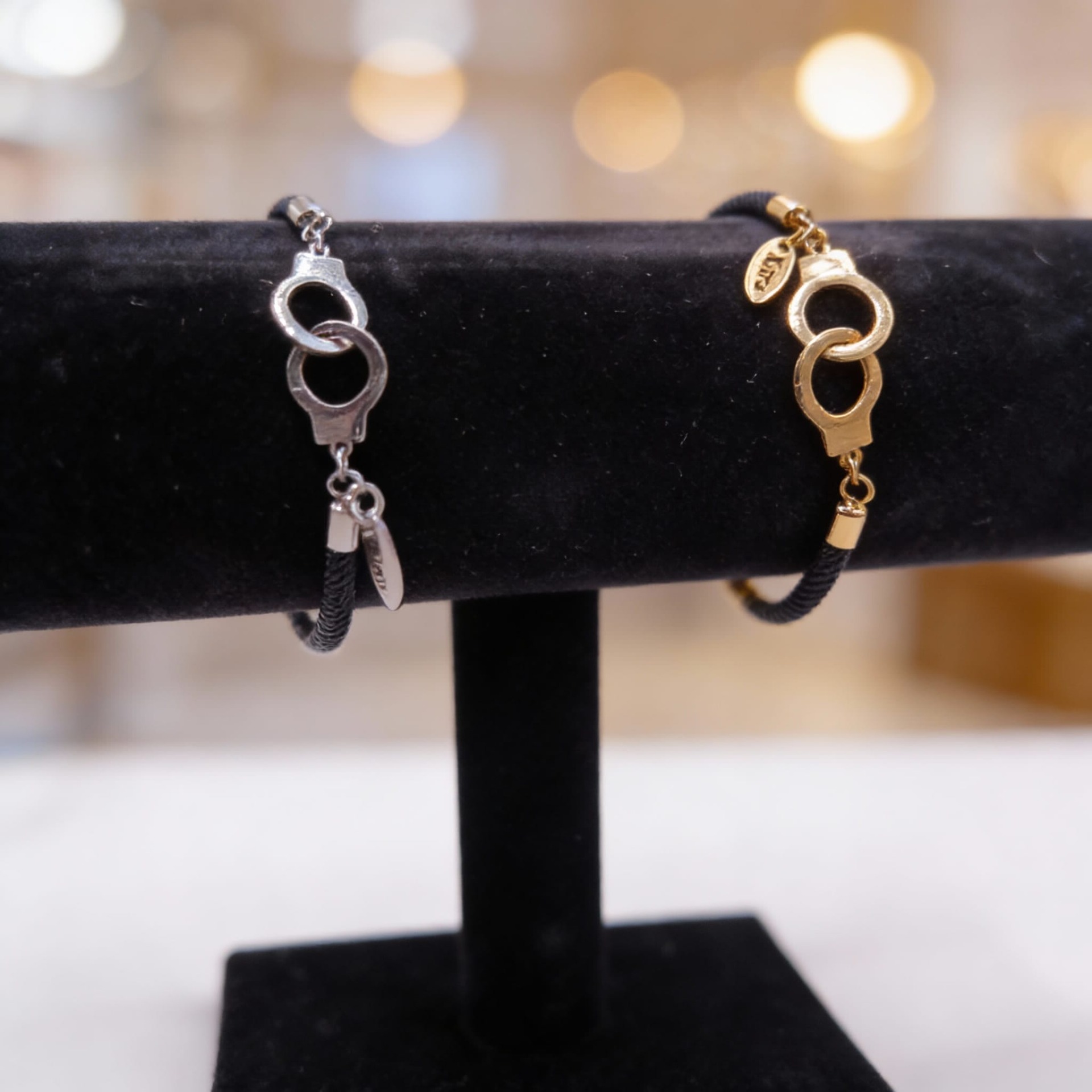 Pulseira em cordão tecido preto, com pormenor de algemas em aço inoxidável, feito à mão para a coleção Kora.