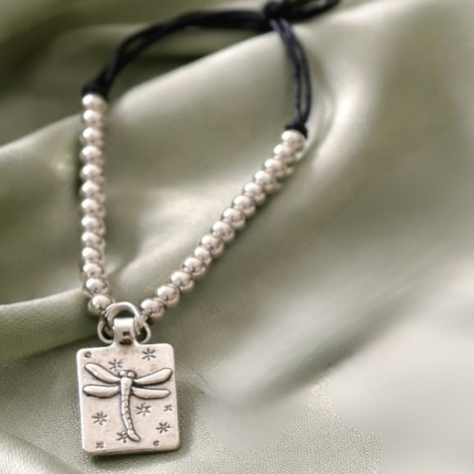 Pulseira de cordão escuro com detalhes em em aço inoxidável prateado e pormenor pingente libelinha em metal.