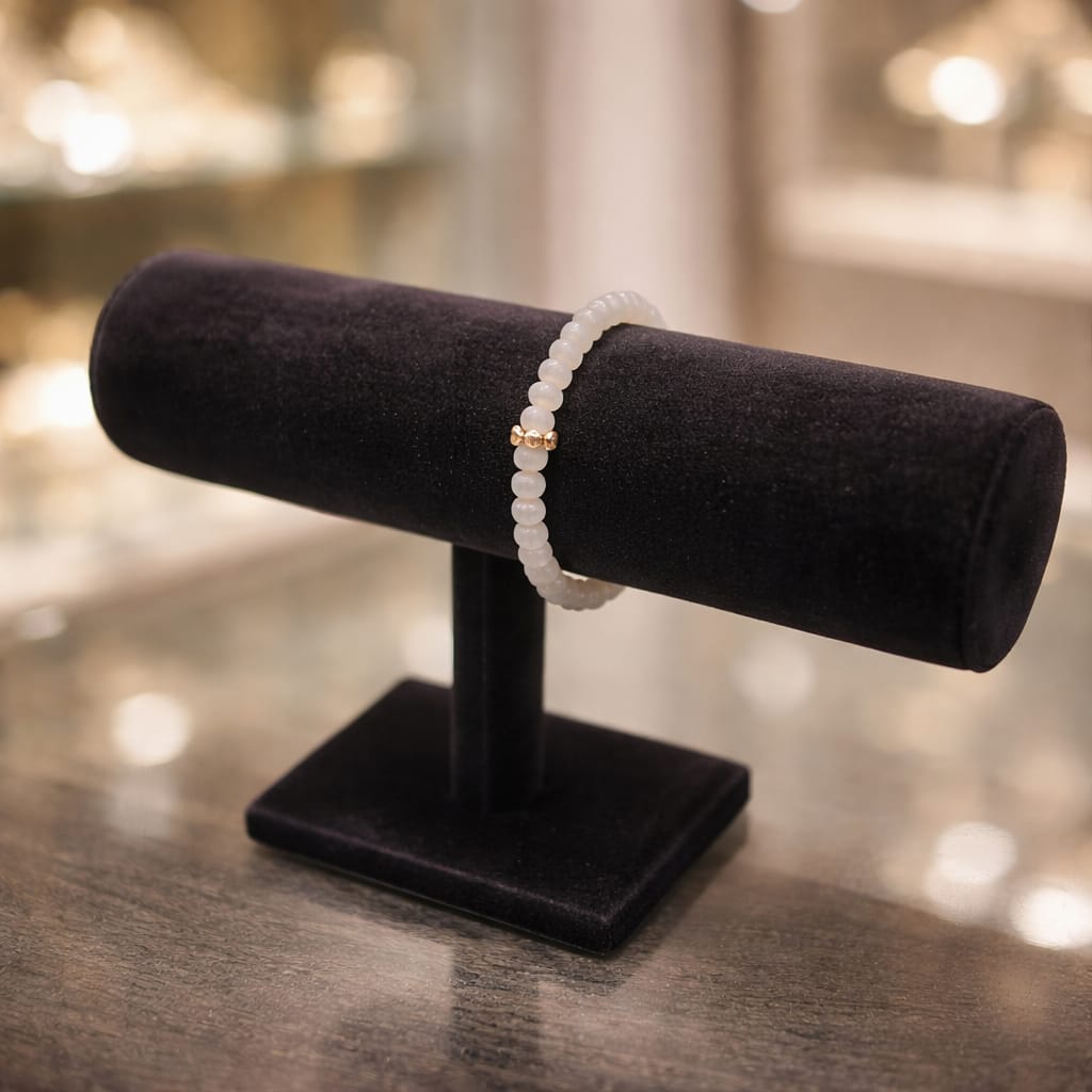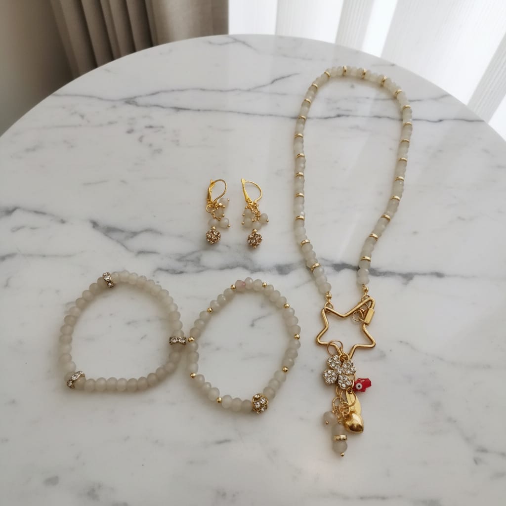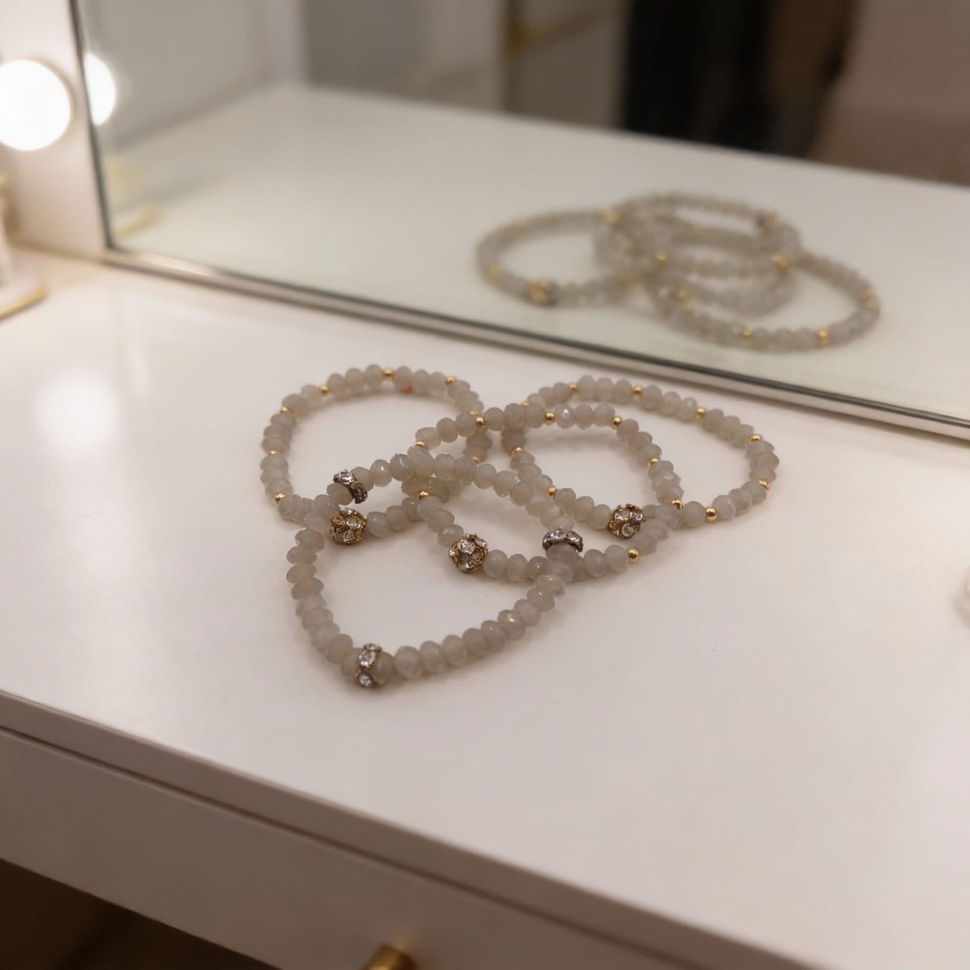 Pulseira com pedras, detalhes dourados e pormenor de bola com cristais encrustados. Feita à mão.