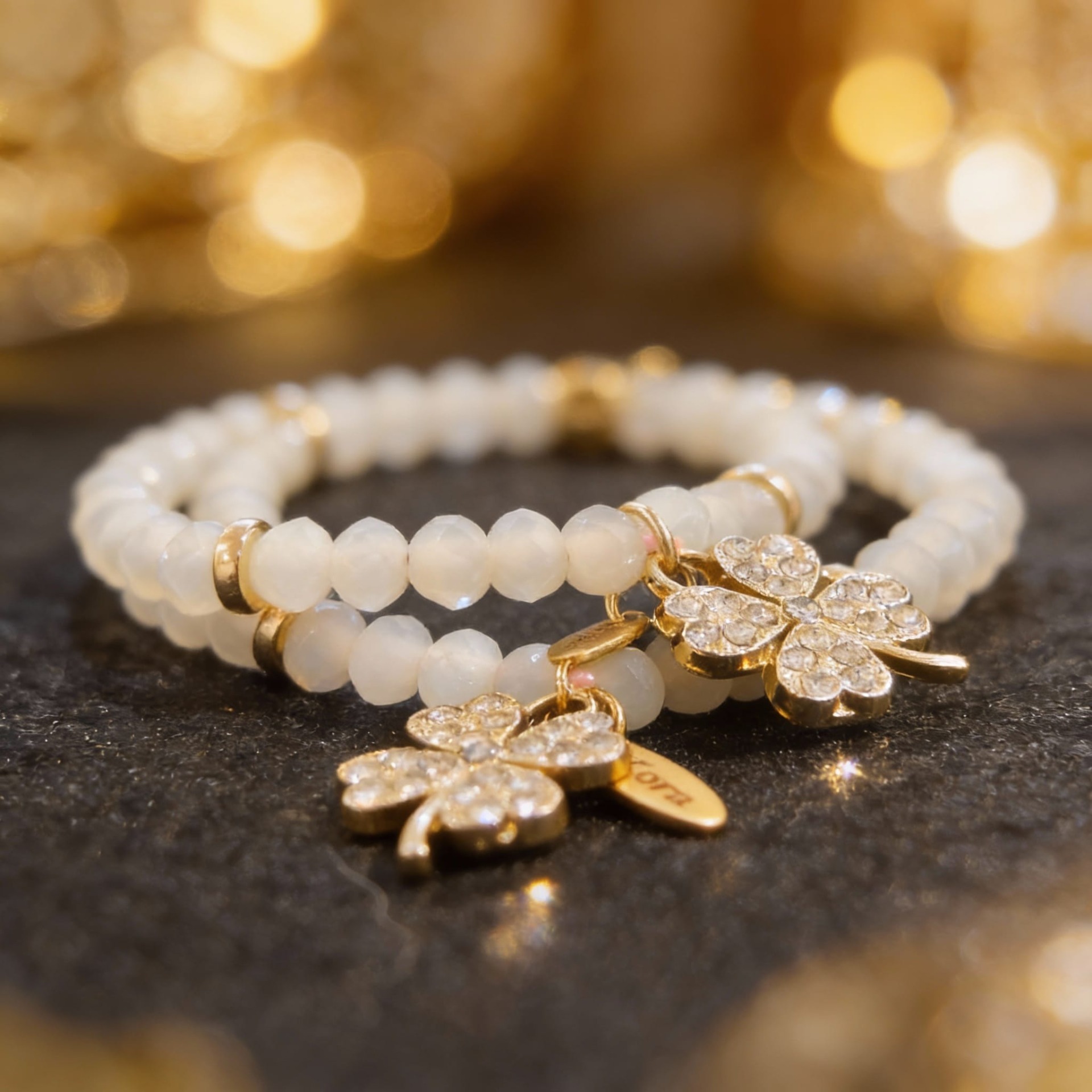 Pulseira trevo com cristais tom pastel e trevo com cristais encrustados em aço inoxidável. Uma peça feita à mão com muito carinho e para atrair sorte.